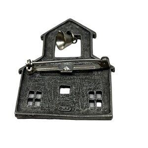 Vintage JJ School Brooch Pewter Tone Moveable Bell Old Schoolhouse Pin