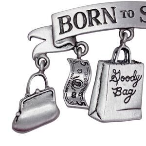 Vintage JJ Signed Pewter Born To Shop Brooch Whimsical & Funny Giftable Jewelry