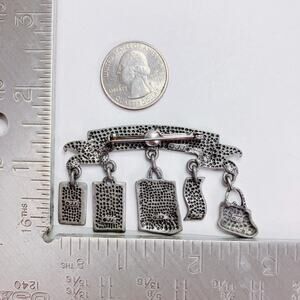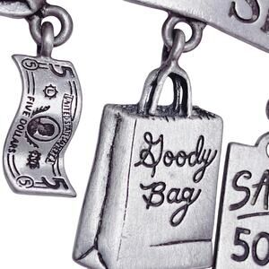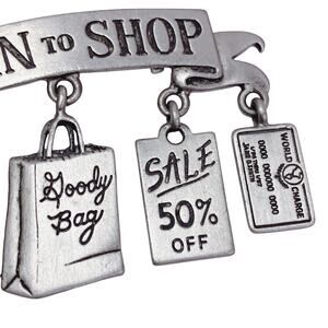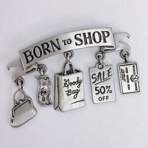 Features: Raised “Born to Shop” banner with five dangling charms; handbag, five-dollar bill, shopping bag, sale tag, and credit card motifs; textured reverse; signed JJ on back; rollover safety clasp