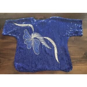 Vintage JLB 100% Silk Sequin Blue Silver Short Sleeve Top Blouse Women's Size Large. In good used condition with imperfection on back of neck shown in last photo. Approximately 21 inches long and approximately 21 inches pit to pit.