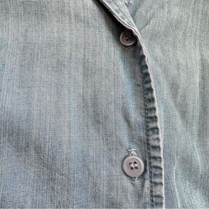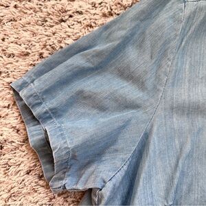 Blue short sleeve button down with butterflies embroidered along the hem. Tencel lycocell-cotton blend, lightweight, great solo or layered. Features notched sides at hem, darting at chest, collared neckline. Women’s plus size 16W, measurements in photos. Pre-owned in excellent vintage condition, no holes or stains.