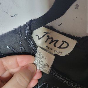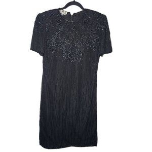 Vintage JMD Womens Black Beaded Short Sleeve Silk Midi Dress