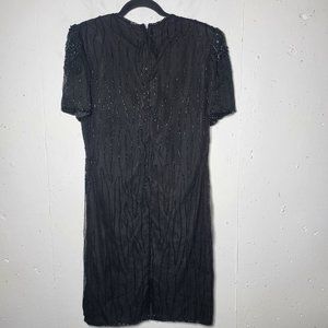 Vintage JMD Womens Black Beaded Short Sleeve Silk Midi Dress Size Small Glam