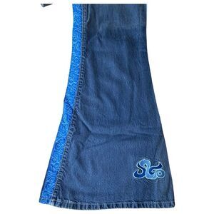 Details: Charade style S1087, super flare leg with 14" leg opening, mid rise approx. 10.5", contrast blue patterned inset and piping, embroidered logo at hem, made in USA