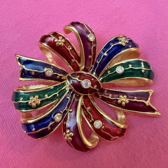 Vintage JOAN RIVERS Gold-tone Christmas Enamel & Rhinestone Bow Brooch / Pendant