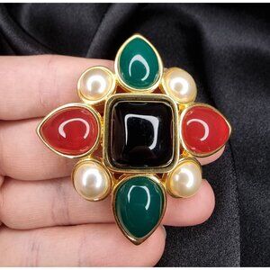 At its center rests a deep black cabochon, radiating mystery and grounding power. Surrounding it are teardrop cabochons in rich emerald green and crimson red, accented with creamy faux pearls—a color palette reminiscent of historic heraldry and aristocratic jewels.