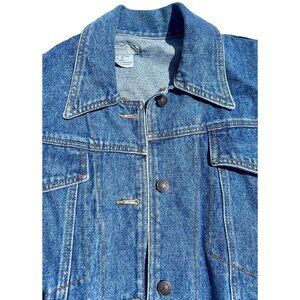 This vintage denim jacket, crafted from 100% cotton, offers a timeless design. Featuring front pockets and button closure, it embodies retro style and durability.