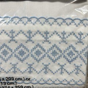*White with blue cross stitch design.