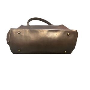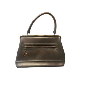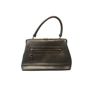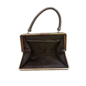 This vintage Julius Resnick purse is a black patent handbag with gold-tone hardware. It has a classic 1960s style, made of PVC material in the United States. The purse features a Secretary/Geek look, suitable for everyday use by adult unisex individuals. It is an original piece, unmodified, reflecting the brand's unique design aesthetic.