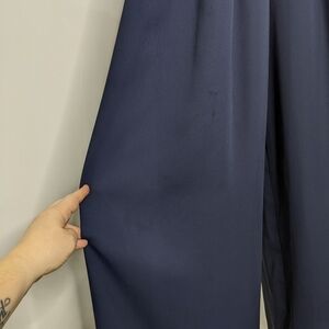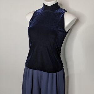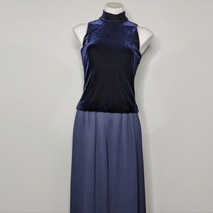 Vintage J.R. Nites blue velvet & chiffon halter jumpsuit 6. Top is a fitted velvet, bottom is a lighter blue flowy chiffon style. Some grease spots on the leg, not as noticeable with wear (see photo)