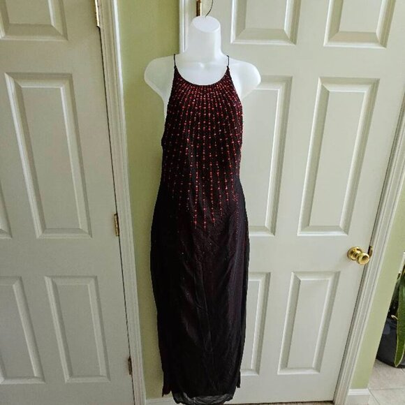 Vintage JSBoutique 90s Red & Black Beaded Criss Cross Back Maxi Formal Dress