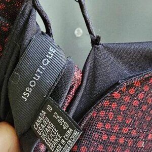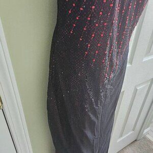 Vintage JSBoutique 90s Red & Black Beaded Criss Cross Back Maxi Formal Dress - great preowned condition, two flaws include some loose or missing beads and the zipper pull was taken off so put a charm pull on it to use the zipper as shown. Plus some slight wear on the straps. Zipper back, half top open back with criss cross black thin straps in an X on the upper back. Sleeveless maxi formal dress. Form fitted and slight flare at the bottom. Black sheer mesh cover down most of the dress. Scoop neck, form fitted. Black with bright red beading down the front of the dress like a cascading effect - looks like blood drops as well, gothic punk grunge emo vibes. Red sequin design underneath the black on the rest of the dress.