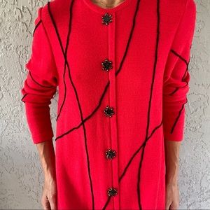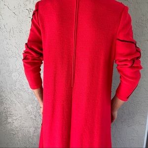Vintage J.S.S. Red wool/rayon size small dress. Black pipping detailing across the front with 7 large black and gold fixed decorative buttons. Center back zipper sensor. There is a small snag directly above the fourth button. Made in USA. This is a super unique vintage piece!