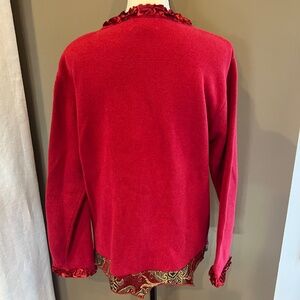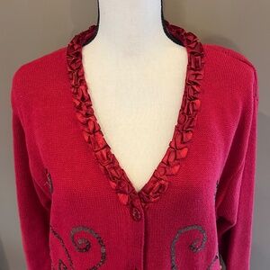 Absolutely beautiful sweater in excellent condition, rich red color with gorgeous sequin detail and detail on neckline and hem.