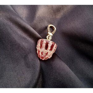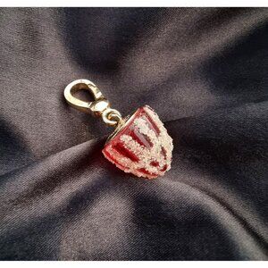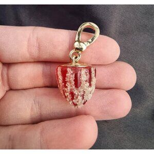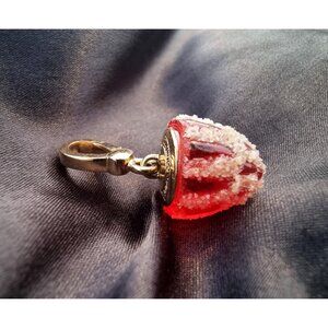 This Juicy Couture pendant is a charm with a gold-toned clasp and a red strawberry-shaped design. The pendant is crafted with a shiny red enamel base and has a textured white "frosting" layer resembling sugar crystals. The gold clasp allows for easy attachment to a charm bracelet, necklace, or bag, showcasing Juicy Couture's playful and whimsical style. It’s an eye-catching and vibrant accessory that reflects a luxurious yet fun aesthetic.