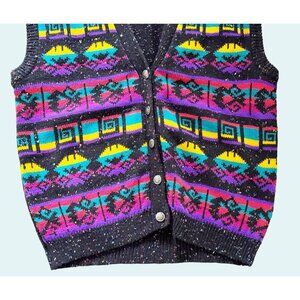 Cool vintage sweater vest by Justine Todd. Circa 1990s. Multi color with southwest inspired design. V neck with decorative silver buttons. 85% acrylic / 15% polyester. Tag is a size 1X. Listed as a size L based on measurements (see size diagram in photo section). Pre-owned and gently worn in really nice condition!