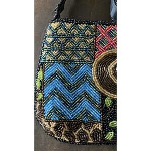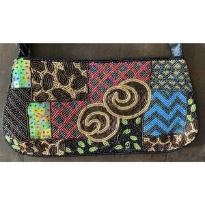 Vintage J&X NY Intricate Hand Beaded Strap & Bag Sequins Evening Boho Clutch. Quality hand-beaded abstract design. 10” strap drop, 10” across and 5” tall large enough for cell phone. Measurements shown in photos