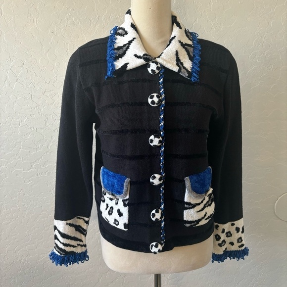 Vintage Jack B Quick Black Blue Animal Print Cardigan Pocket Sweater Size Small