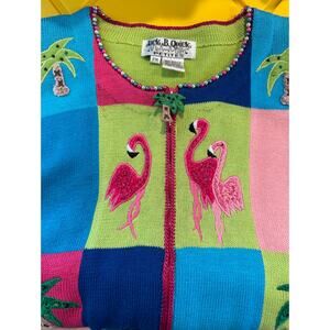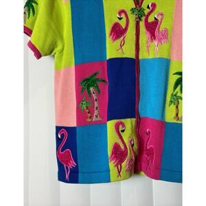 Vintage Jack B Quick Cardigan Sweater Flamingos & Palm Trees Short Sleeve ZipUp