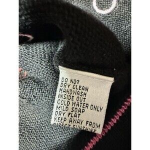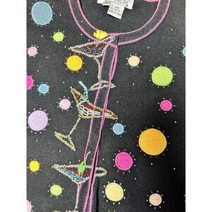 This Vintage Jack B. Quick Cocktail Embellished Cardigan Sweater in women's size S is a stylish and unique piece perfect for the winter and fall seasons. Made from a blend of rame and cotton, the sweater features long sleeves, a round neckline, and is adorned with beadwork and embroidery accents. The vintage theme, along with the cocktail and martini motifs, gives this cardigan a fun and retro flair. Ideal for a hand wash only, this black sweater with shoulder pads is a fashionable addition to any woman's wardrobe.