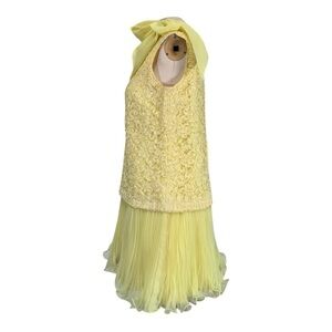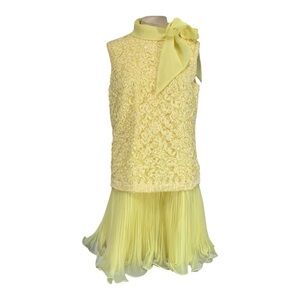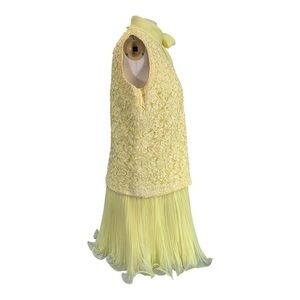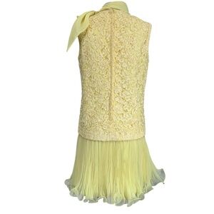 Features: This dress scream Jackie Kennedy! This is timeless vintage 1960s Jack bryan of california Above the knee dress. Sleeveless. High neckline with chiffon tie detail. Texture detail throughout. Pleated flowy above the knee skirt (depending on how tall you are). Zip back closure.