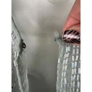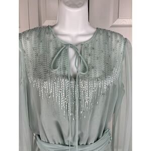 Features: lined, chiffon beaded overlay, long sleeve sheer, tank dress underneath attached , color is a gray green