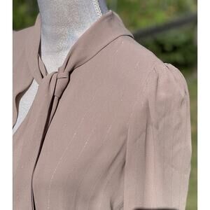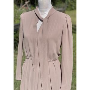 Beautiful vintage tie neck chiffon lined dress in a mushroom beige with subtle gold thread vertical stripes. In excellent condition. Belt loops on side of waist but no belt included—probably a slim patent leather belt was included originally.