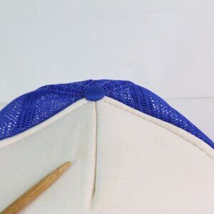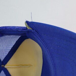 Please Note: this hat will need to be repaired. The corner seam has come undone and you can see this in the seventh photo. There is also light spotting on the white. A bit of fading on the inside head band.