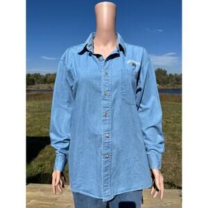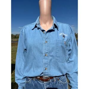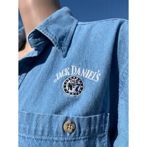 Elevate your wardrobe with this classic vintage Jack Daniels denim button-up shirt! Crafted from 100% cotton, this shirt offers both comfort and style. Perfect for casual outings or adding a touch of retro flair to your look.