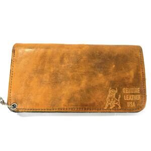 Authentic vintage Jack Daniel’s “Old Time Old No. 7 Brand” biker wallet with chain. Made of genuine leather in the USA, this rugged wallet features an embossed Jack Daniel’s logo on the front and a bull logo with “Genuine Leather USA” on the back.