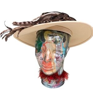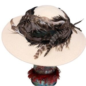 A rare and dramatic piece of vintage millinery from iconic designer Jack McConnell. This boutique cream wool felt hat features a sculpted wide brim and a luxurious arrangement of real feathers, including curled rooster hackles and striped pheasant plumes. Bold, theatrical, and unmistakably couture.