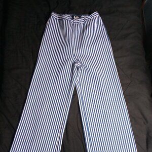Vintage Jack Winter Mod Striped Polyester Pants Flared - No Pockets - Size Medium (Estimate, No Size Tag) - Measures Waist(Flat)=13" Inseam=28" Front Rise=13" Bottom Opening(Flat)=11" - Excellent Condition, No Flaws - White Color Pants With Blue Stripes