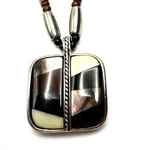 Vintage Jack Woolsey Silver Inlay Pendant Necklace—MOP, Onyx, Jasper, Bone—EUC