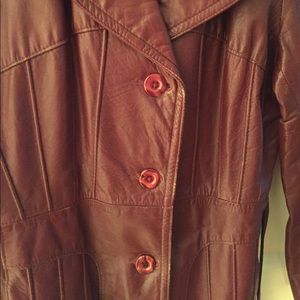 Vintage leather jacket 1970s styled, with three buttons and ties around waste. Distressed aged well, inner lining ripped would need to be sown inside, everything on the outside with the leather is fine.