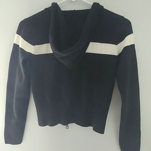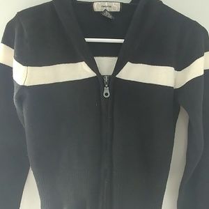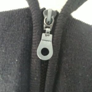It has a double zipper in front and it also has a hood.