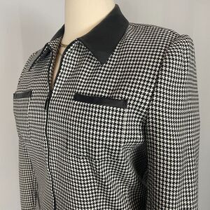 Vintage Jacket Size 14 Black White Houndstooth Full Zip Faux Leather Trim 90s