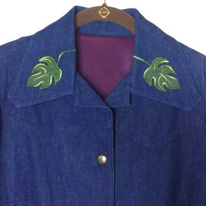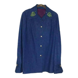 Vintage Jacket Womens Medium Denim 70s Embroidered Textured Floral Snap Button