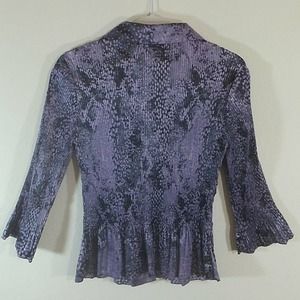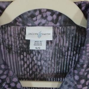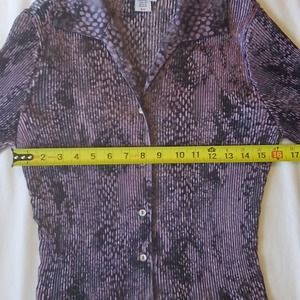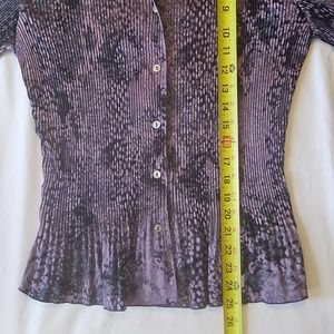 Vintage Jaclyn Smith pleated button down blouse. Really pretty with purple dots on black with tight pleats all around. This blouse is in very good pre-owned condition. Tag size S. Please look at the photos. They show the actual measurements taken laying flat. Pit to pit 16", length 25".
