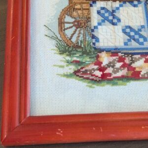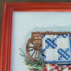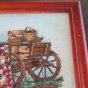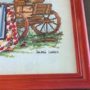 Vintage Jacob's Ladder Country Scene Cross-Stitch Art with Red Wood Frame. This beautifully crafted cross-stitch art piece features a rustic wagon, quilts, and a basket of apples. The piece of Americana Art is elegantly framed in a red wooden frame, adding a touch of country warmth to any room.