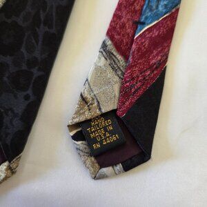 For sale is ONE vintage Jacobson's Silk Necktie. The tie is black, gray, red, blue and white art deco/geometric design. The tie measures 4 inches wide and 56 inches long. The tie is made from silk and is in very good used condition. The tie was made for Jacobson's Department store, a high-end regional retailer serving Michigan and other states in the Midwest as well as Florida.