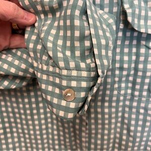 Gorgeous green and white gingham with shell buttons. Two front flap pockets. Great for a work setting or casual with jeans. Feels luxurious made of 100% silk. A staple classic piece for any wardrobe.