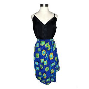 Fun print vintage 1990's faux wrap skirt size 12. Button and zipper closure with elastic on either side of the back for extra comfort.