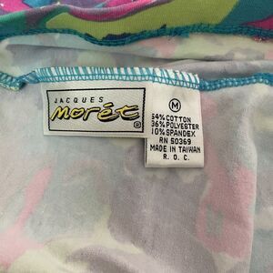 This vintage Jacques Moret activewear set likely dates from the late 1980s to early 1990s and features a bold neon, tropical color palette that's classic for the era. It includes a loose-fitting short-sleeve top with an underwater graphic and neon accents, paired with high-rise, capri-length leggings in a coordinating abstract print. The top is one size and made in the USA, while the leggings are marked a medium and made in Taiwan. Due to the vintage fit, the set is best suited for a modern size small or medium. The leggings are stretchy with a slim, fitted silhouette. The set is in excellent pre-owned condition with little to no signs of wear. Measurements are included in the photos.