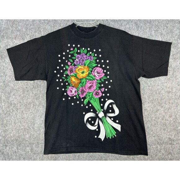 Vintage Jacques Moret Graphic T-Shirt Flowers Print One Size Black Single Stitch