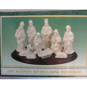 Vintage Jade Collection 11 Piece Nativity Set Porcelain Figures Wood Base