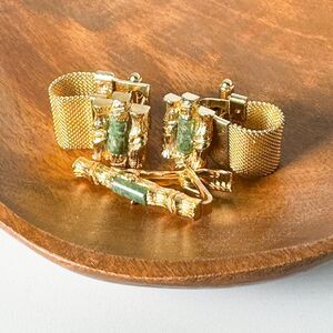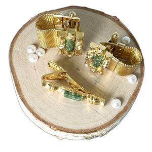 Elevate your accessory game with this stunning vintage cufflinks & tie clip set featuring genuine jade accents. Crafted in a classic gold-tone finish with bamboo stalks, these cufflinks and tie clip add a touch of sophistication to any ensemble. The intricate design showcases the natural beauty of jade stones, surrounded in gold tone bamboo stalks adding a unique Asian and elegant flair to your look. Perfect for formal occasions or adding a stylish touch to your everyday attire. Don't miss out on this timeless set that exudes both style and refinement.