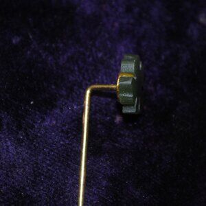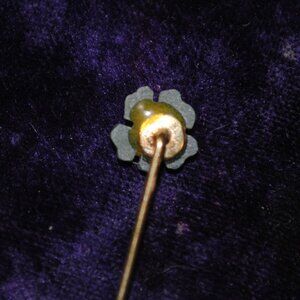 This is a vintage little shamrock stick pin that looks to be made of jade or some other green stone. The glue holding the pin to the top can be seen on the back. Overall, the piece is in pretty great used condition.