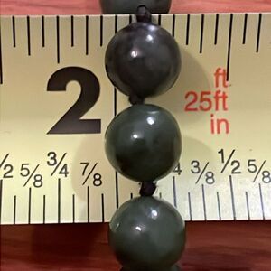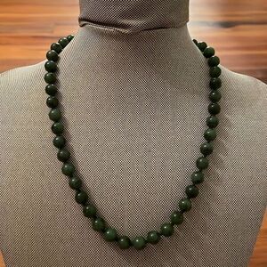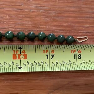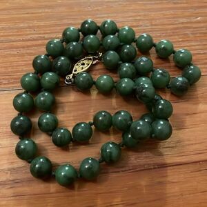 Vintage, green, round bead, jade necklace by ROC Republic of China. The necklace measures about 18 inches from end to end and has about an 8.5 inch drop. There is a gold tone, filigree metal clasp marked ROC. The beads have been together knotted with green thread. Approximate measurements shown in photos. In great pre-owned condition with little to no signs of wear.