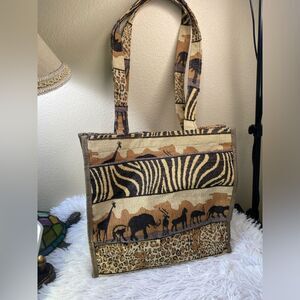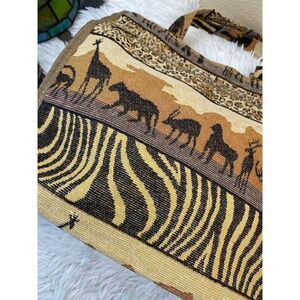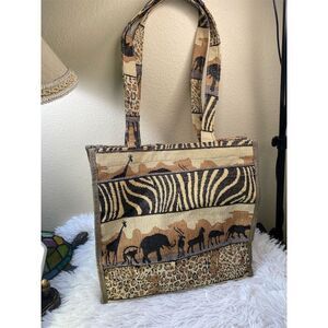 Jade Women's Tote in Brown/Tan with Multi-Colored Animal Prints. Made from tapestry fabric with an African Safari theme. Features include beautifully detailed tapestry, sturdy shoulder straps, secure zipper closure, interior coin purse, spacious interior, multiple compartments, and hook & loop closure. Pre-owned condition. Inside zipper does not work.