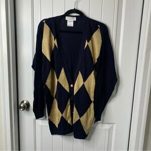 Vintage Jaeger Argyle metallic gold navy sweater cardigan size small made in UK